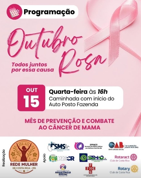 A cidade de Costa Rica se prepara para a Caminhada do Outubro Rosa 2025, promovida pela Rede Mulher de Combate ao Câncer em parceria com a Prefeitura por meio das secretarias de Saúde, Assistência Social, Agricultura e de Políticas Públicas para Mulheres. O evento, que acontece nesta quarta-feira, dia 15, às 16h, tem como objetivo sensibilizar a população sobre a importância da prevenção e do diagnóstico precoce do câncer de mama. O ponto de encontro será no pátio do Auto Posto Fazenda.