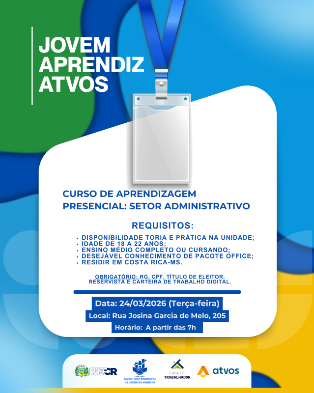 A Prefeitura de Costa Rica, por meio da Secretaria de Desenvolvimento e da Casa do Trabalhador, em parceria com a Atvos, está com oportunidade aberta para o programa Jovem Aprendiz na unidade do município. A seleção será realizada presencialmente no dia 24 de março de 2026, às 7h, na Casa do Trabalhador, localizada na Rua Josina Garcia de Melo nº 205, no Centro. A iniciativa busca pessoas engajadas em contribuir com a transição energética e impulsionar o futuro, oferecendo formação profissional no setor administrativo.