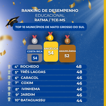 O município de Costa Rica conquistou destaque no cenário educacional de Mato Grosso do Sul ao aparecer em 2º lugar no ranking geral de desempenho da Ratma (Rede de Assistência Técnica para Monitoramento e Avaliação dos Planos Municipais), ligado ao Tribunal de Contas do Estado de Mato Grosso do Sul (TCE-MS). O levantamento aponta que apenas três cidades do Estado alcançaram nível “bom” no cumprimento das metas educacionais, com índices entre 52% e 54%.