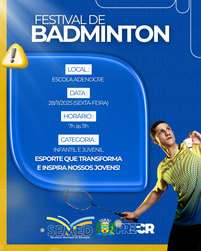 Na sexta-feira, 28 de novembro, será a vez do Festival de Badminton, que acontecerá na Escola Municipal Cívico-Militar Professor Adenocre Alexandre de Morais, também das 7h às 11h. O badminton, que vem ganhando popularidade entre os alunos, será celebrado com jogos e demonstrações que reforçam a importância do esporte como ferramenta de disciplina, foco e desenvolvimento motor.