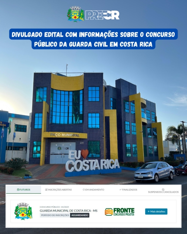 A Prefeitura Municipal de Costa Rica/MS anunciou nesta terça-feira, 8 de julho, o Concurso Público nº 01/2025, que será realizado pela Fronte Concursos e Projetos LTDA, para selecionar Guarda Civis. As inscrições ocorrerão de 11 de julho a 10 de agosto de 2025, exclusivamente online, com taxa de R$ 100,00. É necessário que os candidatos sigam as normas do edital e que não tenham vantagens no processo, pois a violação pode levar à eliminação. O concurso será composto por provas objetivas, avaliação física, exames de saúde, avaliação psicotécnica, investigação social e um curso de formação, oferecendo 25 vagas e cadastro de reserva.