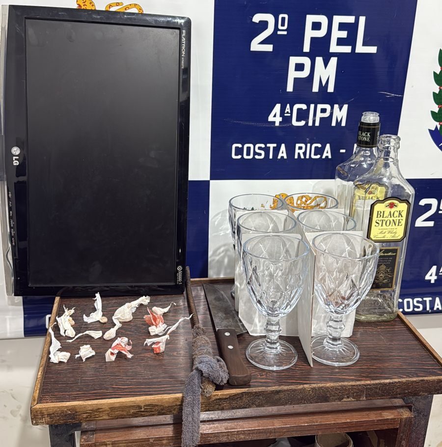 Também foram apreendidos diversos objetos de procedência suspeita: uma bicicleta aparentemente nova, pintada de preto para ocultar sua originalidade, aros de bicicleta, um jogo de taças, uma televisão da marca LG, um celular Redmi ainda em estado de novo e um chucho (arma artesanal).