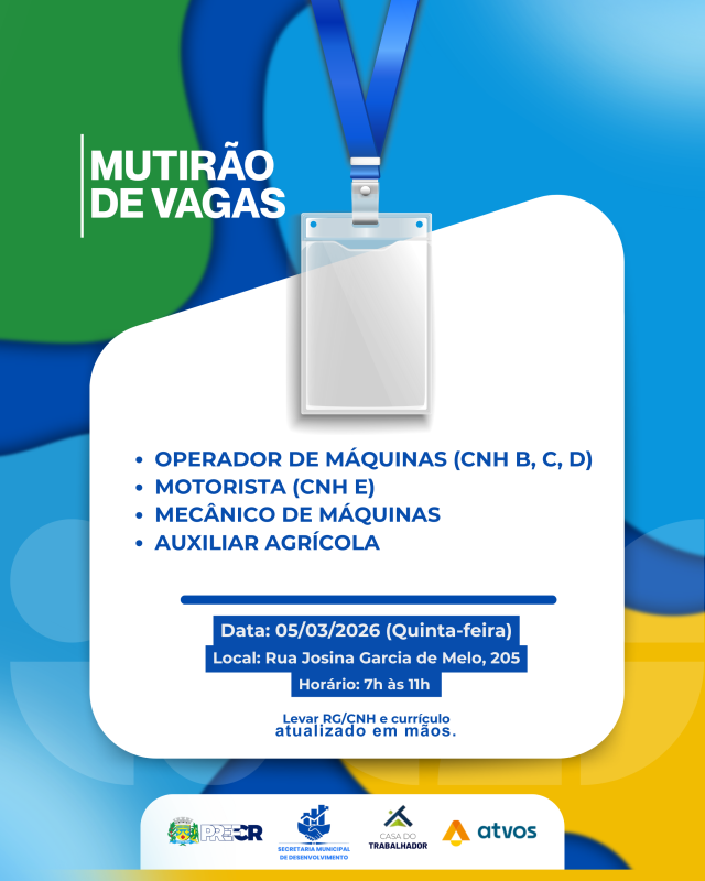 A Casa do Trabalhador de Costa Rica realiza nesta quinta-feira, 5 de março de 2026, mais um Mutirão de Vagas com oportunidades para Operador de Máquinas (CNH B, C, D), Motorista (CNH E), Mecânico de Máquinas e Auxiliar Agrícola. A ação é promovida pela empresa Atvos, com organização da Prefeitura de Costa Rica, por meio da Secretaria de Desenvolvimento.