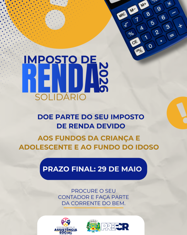 A Campanha de Destinação do IRPF 2026 “Eu Sou Cidadão Solidário” já está em andamento em Costa Rica/MS, buscando incentivar a doação de parte do Imposto de Renda devido aos Fundos Especiais do município. Lançada no dia 23 de março de 2026, a iniciativa busca mobilizar cidadãos e empresas a contribuírem com o Fundo Municipal para a Infância e Adolescência e o Fundo Municipal do Idoso.