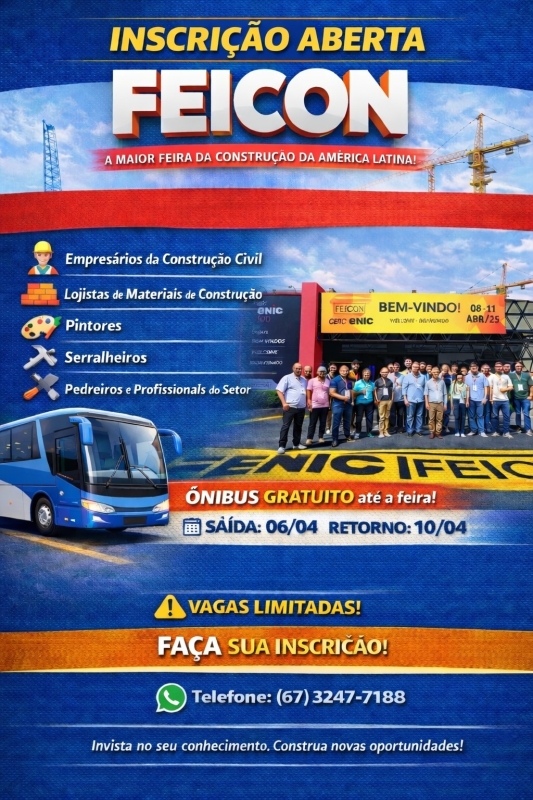 Além do transporte, os profissionais devem realizar o credenciamento gratuito para a Feicon 2026, disponível até o dia 22 de março. Após essa data, o acesso pode estar sujeito a cobranças conforme as regras da organização do evento.